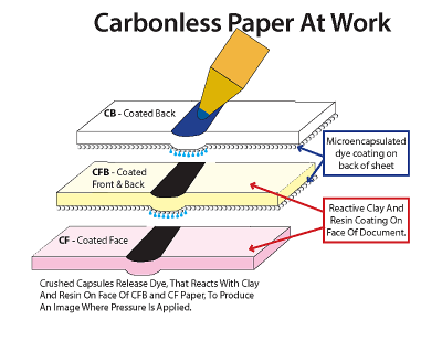 carbonless paper is a sheet of paper impregnated with dye which transfers writing or typing onto the copying surface below without the necessity for carbon pigment – see diagram above.